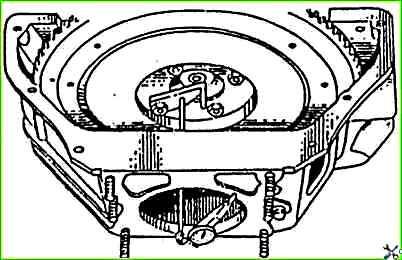 Вращая коленчатый вал, проверяют биение отверстии для центрирующего бурта коробки передач, а также перпендикулярность заднего торца картера сцепления относительно оси коленчатого вала, как показано на рис. 1 и рис. 2.