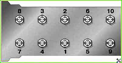 - - надеть на шпильки головки цилиндров прокладку, установить головку и закрепить ее гайками с шайбами. Затянуть гайки динамометрическим ключом с моментом 7,3-7,8 кГм, соблюдая порядок, указанный на рис. 20;