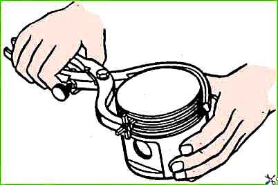 - - надеть с помощью приспособления на поршень поршневые кольца. Компрессионные кольца ставят внутренней фаской к днищу поршня, как показано на рис. 12, кольца в канавках должны перемещаться свободно;