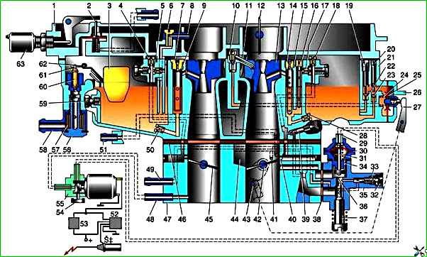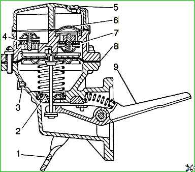 Ускорительный насос — диафрагменного типа. для обогащения горючей смеси при полной нагрузке во второй камере предусмотрен эконостат.