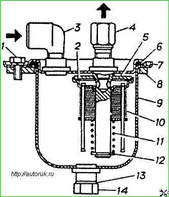 Далее топливо проходит через топливный фильтр, состоящий из корпуса, пластикового стакана-отстойника и фильтрующего элемента.