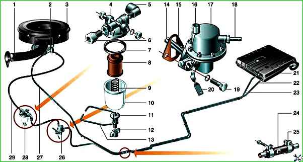 Топливо из бака по топливопроводу поступает к диафрагменному насосу. Он приводится в действие от эксцентрика распределительного вала, который действует на рычаг привода насоса.
