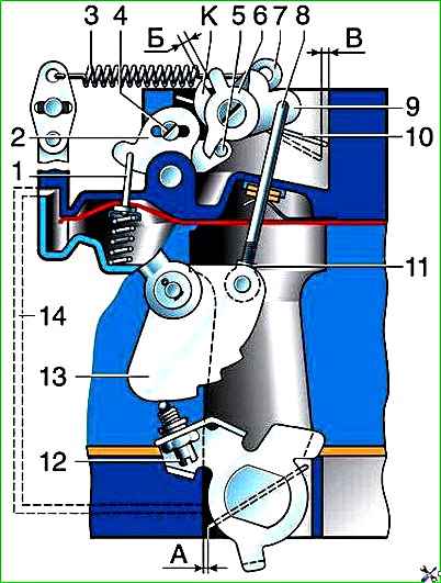 Схема пускового устройства 1 - шток диафрагменного механизма; 2 - левая часть двуплечего рычага пускового устройства; 3 - пружина закрытия воздушной заслонки; 4 - стяжной винт двуплечего рычага; 5 - усик на правой части двуплечего рычага; 6 - рычаг на переднем конце оси воздушной заслонки; 7 - закрывающий рычаг на заднем конце оси воздушной заслонки; 8 - тяга пускового устройства; 9 - промежуточный рычаг; 10 - воздушная заслонка; 11 - резьбовая головка на конце тяги (для ранних моделей карбюраторов); 12 - регулировочный винт-упор приоткрытия дроссельной заслонки; 13 - кулачок; 14 - канал подвода разрежения к диафрагме пускового устройства; А, Б, В - зазоры; К - выступ рычага 9