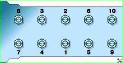 Головкой на 19 отворачиваем десять гаек крепления головки блока в последовательности обратной затяжке