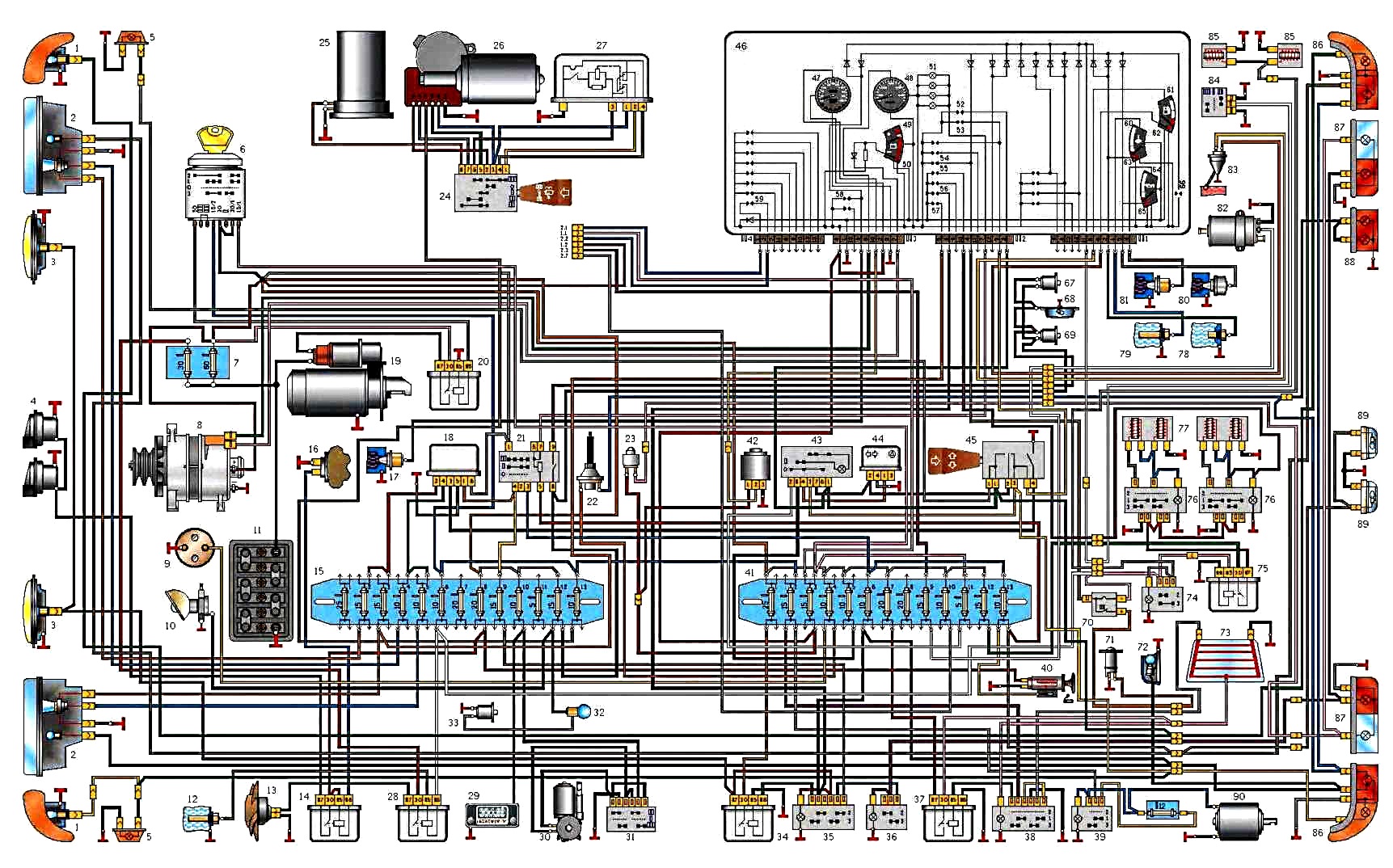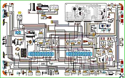 Электрическая схема ГАЗ-3110: 1 – указатель поворота 2 – фара 3 – противотуманная фара 4 – звуковой сигнал 5 – боковой повторитель 6 – замок зажигания 7 – блок предохранителей в моторном отсеке 8 – генератор 9 – штепсельная розетка 10 – подкапотная лампа 11 – аккумуляторная батарея 12 – датчик включения электровентилятора 13 – электровентилятор 14 – реле звукового сигнала 15 – левый блок предохранителей 16 – выключатель звукового сигнала 17 – датчик падения уровня тормозной жидкости 18 – реле включения фар 19 – стартер 20 – реле стартера 21 – центральный переключатель света 22 – выключатель сигнала торможения 23 – выключатель света заднего хода 24 – переключатель стеклоочистителя 25 – электронасос стеклоомывателя 26 – электродвигатель стеклоочистителя 27 – реле стеклоочистителя 28 – реле электровентилятора 29 – радиоприемник 30 – электродвигатель антенны 31 – переключатель антенны 32 – лампа освещения вещевого ящика 33 – выключатель лампы освещения вещевого ящика 34 – реле противотуманных фар 35 – выключатель противотуманных фар 36 – выключатель ламп заднего противотуманного света 37 – реле обогрева заднего стекла 38 – переключатель обогрева заднего стекла 39 – переключатель вентилятора отопителя 40 – прикуриватель 41 – правый блок предохранителей 42 – датчик спидометра 43 – выключатель аварийной сигнализации 44 – реле-прерыватель указателей поворота 45 – переключатель указателей поворота 46 – комбинация приборов 47 – спидометр 48 – тахометр 49 – вольтметр 50 – контрольная лампа разряда аккумуляторной батареи 51 – лампа подсветки приборов 52 – контрольная лампа правого поворота 53 – контрольная лампа левого поворота 54 – контрольная лампа стояночного тормоза 55 – контрольная лампа обогрева сидений 56 – контрольная лампа габаритного света 57 – контрольная лампа дальнего света фар 58 – контрольная лампа падения уровня тормозной жидкости 59 – контрольная лампа КМСУД 60 – указатель температуры охлаждающей жидкости 61 – указатель уровня топлива 62 – контрольная лампа резерва топлива 63 – контрольная лампа перегрева охлаждающей жидкости 64 – указатель давления масла 65 – контрольная лампа аварийного падения давления масла 66 – дублирующая контрольная лампа 67 – выключатель плафона передней двери 68 – плафон освещения салона 69 – выключатель плафона задней двери 70 – прерыватель контрольной лампы стояночного тормоза 71 – выключатель контрольной лампы стояночного тормоза 72 – фонарь освещения багажного отделения 73 – элемент обогрева заднего стекла 74 – выключатель обогрева жиклеров стеклоомывателя 75 – реле обогрева сидений 76 – выключатель обогрева сидений 77 – элементы обогрева сидений 78 – датчик контрольной лампы перегрева охлаждающей жидкости 79 – датчик указателя температуры охлаждающей жидкости 80 – датчик контрольной лампы аварийного падения давления масла 81 – датчик указателя давления масла 82 – топливный насос 83 – датчик указателя уровня топлива 84 – выключатель системы диагностики контрольных ламп комбинации приборов 85 – жиклеры стеклоомывателя с электрообогревом 86 – задний фонарь на крыле 87 – задний фонарь на крышке багажного отделения 88 – дополнительный сигнал торможения 89 – фонарь освещения номерного знака 90 – электродвигатель вентилятора отопителя