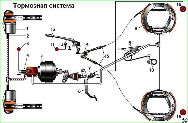 Он состоит из рычага (с рукояткой и стопорным механизмом), промежуточного рычага и его тяги, уравнителя и его тяги, тросов, приводного рычага с тягой в задних тормозных механизмах.
