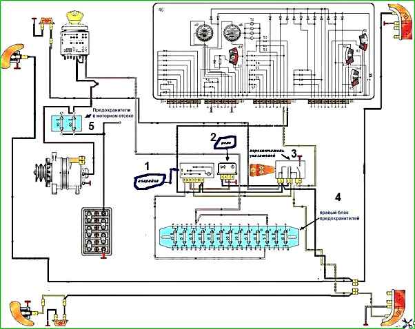 Схема указателей поворота: 1 - аварийный включатель; 2 - реле; 3 - переключатель указателей; 4 - правый блок предохранителей; 5 - предохранители в моторном отсеке