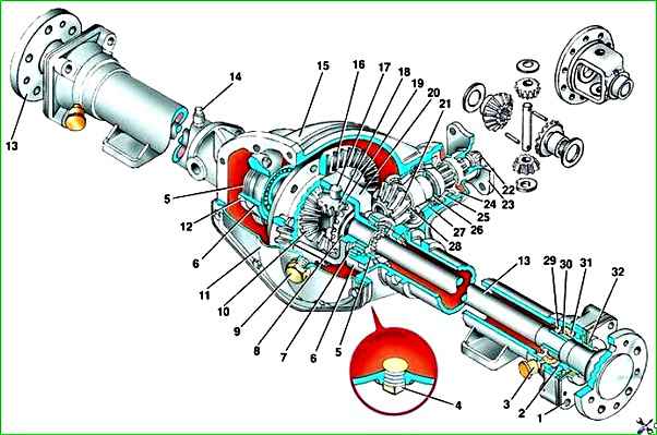 Задний мост ГАЗ-3110:1 - корпус наружного сальника; 2 - подшипник полуоси; 3 - масленка: 4 - маслосливная пробка; 5 - регулировочная гайка подшипника дифференциала; 6 - крышка подшипника; 7 - подшипник дифференциала; 8 - опорная шайба; 9 - маслоналивная пробка; 10 - полуосевая шестерня; 11 - крышка картера; 12 - стопорная пластина; 13 - полуось; 14 - сапун; 15 - картер заднего моста; 16 - ведомая шестерня; 17 - ось сателлитов; 18 - сателлит; 19 - опорная шайба; 20 - коробка дифференциала; 21 - ведущая шестерня; 22 - гайка; 23 - фланец ведущей шестерни; 24 - сальник; 25 - передний подшипник ведущей шестерни; 26 - распорное кольцо; 27 - задний подшипник ведущей шестерни; 28 - регулировочное кольцо; 29 - сальник полуоси; 30 - запорная втулка; 31 - пружинное кольцо; 32 - набивка наружного сальника