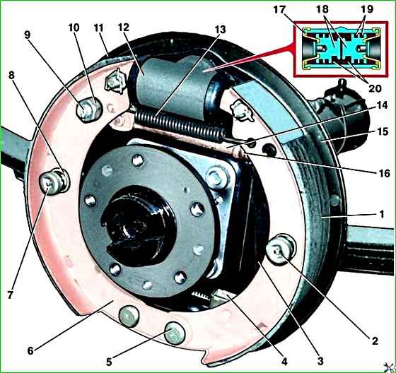 Задний тормозной механизм: 1 – тормозная колодка; 2 – чашка пружины; 3 – приводной рычаг; 4 – трос стояночного тормоза; 5 – опорный палец колодок; 6 – пластина опорных пальцев; 7 – стержень чашки пружины; 8 – прижимная пружина; 9 – регулировочный эксцентрик стояночного тормоза; 10 – гайка; 11 – защитный колпак; 12 – колесный цилиндр; 13 – стяжная пружина; 14 – разжимной рычаг; 15 – щит тормоза; 16 – пружина разжимного рычага; 17 – защитное кольцо; 18 – поршень; 19 – манжета; 20 – упорное кольцо поршня