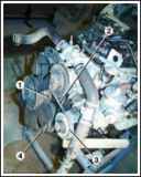 Ослабить натяжение ремня (на фото не показан), для этого ослабить затяжку гайки 1 и регулировочного болта 2 и повернуть кронштейн 3 с натяжным роликом 4 к блоку цилиндров двигателя