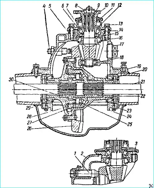 Главная передача и дифференциал смонтированы в отдельный картер редуктора, который свободно вставляют в отверстие картера моста и закрепляют болтами.