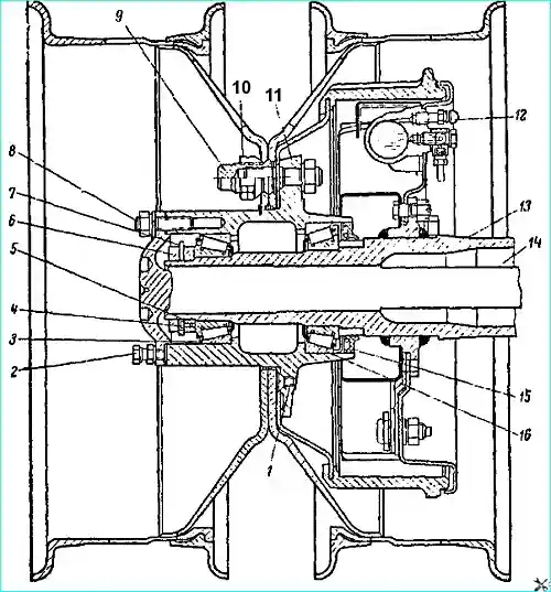 Устройство заднего моста автомобилей ГАЗ-53А и ГАЗ-66 показано на рис. 1 и 2.