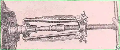 Вынуть из картера ведущий вал с подшипником в сборе и шестерню включения заднего моста и понижающей передачи.