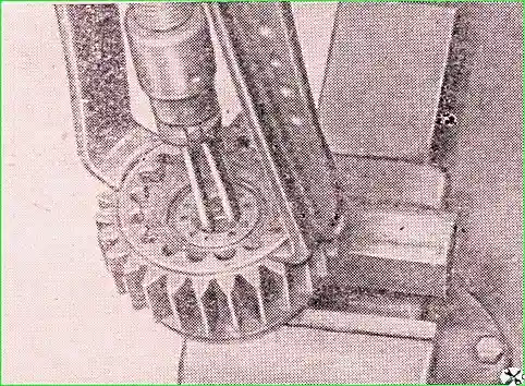После монтажа вала привода к переднему мосту завести в картер шестерню включения переднего моста и ведомую шестерню понижающей передачи.