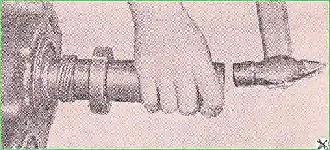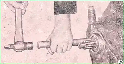 Раскернить и отвернуть гайку крепления заднего шарикового подшипника вала привода к переднему мосту и спрессовать подшипник.