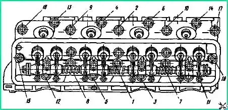 Перед установкой головки цилиндров в сборе с клапанами и выпускным трубопроводом шпильки крепления головки должны быть ввернуты в блок до отказа в порядке, указанном на рис. 1 и таблице.
