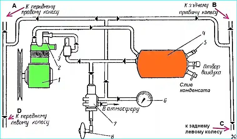 - - При увеличении давления в системе до 5–5,5 кг/см² регулятор давления соединяет разгрузочный цилиндр с воздушным баллоном. В результате воздух под давлением поступает в разгрузочный цилиндр и перемещает поршень 6 (см. рис. 3) вниз.