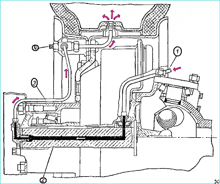 - - Шток поршня, переместившись вниз, открывает клапан 12 и соединяет полость цилиндра с воздушным фильтром двигателя. При ходе поршня компрессора вверх (ход сжатия) воздух вытесняется обратно в воздушный фильтр, а не в систему, т.е. компрессор работает без нагрузки.