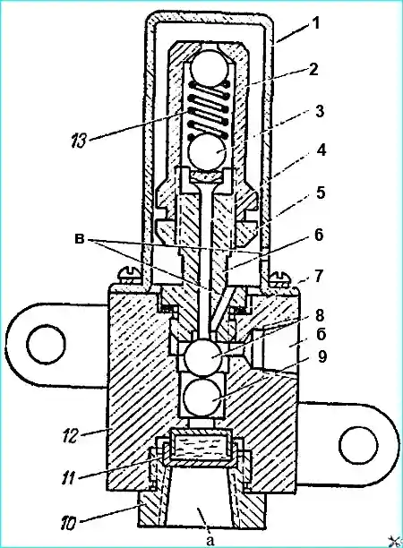 - - Ослабить контргайку 5, отвернуть регулировочный колпак 2 и вынуть стержень 4 клапана, пружину 13 и опорные шарики 3.
