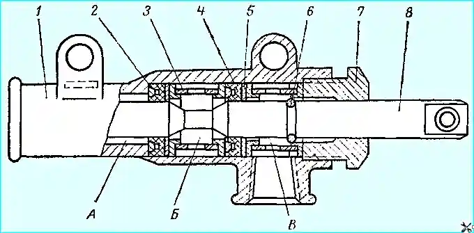 Способ устранения: Заменить искривленный шток с поршнем. Разобрать, промыть и смазать детали цилиндра.