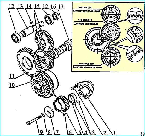 Привод агрегатов: 1 - ось ведущей шестерни привода распределительного вала; 2 - болт крепления оси; 3 - ролики 5,5х15,8 в количестве 62 шт.; 4 - втулка промежуточных роликов; 5 - шестерня ведущая; 6 - шпонка; 7 - шайба упорная; 8 - шайба замковая; 9 - болт М12х1,25х90 крепления насыпного подшипника; 10 - ведущее зубчатое колесо коленчатого вала; 11 - шестерня промежуточная; 12 - шарикоподшипники; 13 - вал колеса привода ТНВД; 14 - шпонка; 15 - шестерня привода ТНВД; 16 - втулка; 17 - распределительный вал в сборе с шестерней