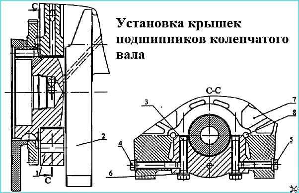 Установка крышек подшипников коленчатого вала: 1 - крышка подшипника; 2 - коленчатый вал; 3 - болт крепления крышки;4болт стяжной крепления крышки подшипника левый; 5 - болт стяжной крепления крышки подшипника правый; 6 - шайба; 7 - блок; 8 - штифт