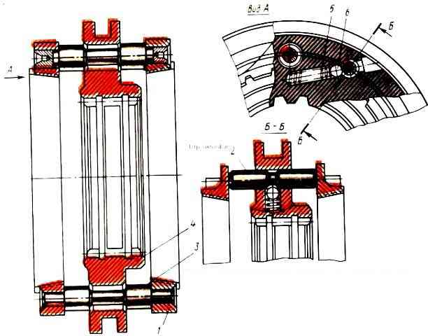 Синхронизатор делителя (рис. 2) состоит из каретки 4, двух одинаковых фрикционных колец 1, шести блокирующих пальцев 3 и шести пальцев 2 фиксаторов.