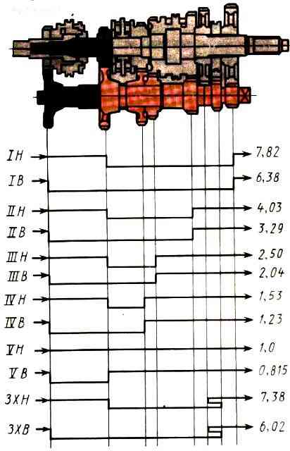В этом случае при включении передач в основной коробке крутящий момент на всех передачах уменьшается в 0,815 раза, а скорость движения соответственно возрастает примерно в 1,22 раза.