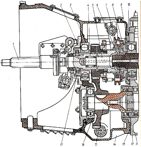Промежуточный вал 15 делителя установлен на двух опорах: шариковом подшипнике, помещенном в гнезде перегородки картера делителя, и роликовом подшипнике, установленном в специальном гнезде, закрепленном в расточке заднего торца картера делителя.