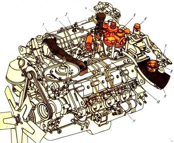 Двигатель состоит из кривошипно-шатунного и газораспределительного механизмов, а также из систем охлаждения, смазочной, питания и регулирования, пуска