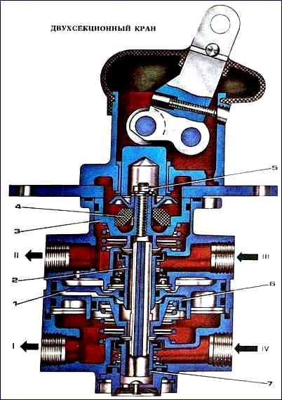 Выводы I и II крана через промежуточные пневмоаппараты соединены с тормозными камерами соответственно передних и задних колес, выводы III и IV — с ресиверами раздельных контуров привода рабочего тормоза.