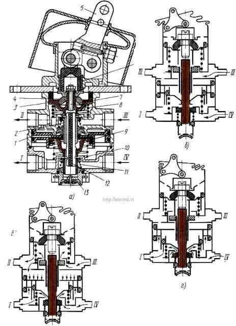 В исходном положении (тормозная педаль отпущена) клапаны 2 к 11 (рис. б) под действием своих пружин закрыты, вывод I разобщен с выводом IV и вывод II — с выводом III с атмосферой они сообщаются через клапан 13.