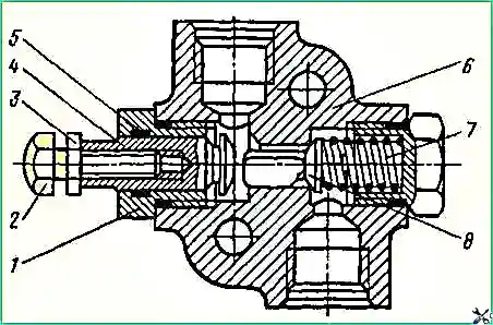 Масло через отверстие в корпусе распределителя проходит под клапаном 7 через седло, штуцер и попадает в магистраль гидроцилиндра автосамосвала.