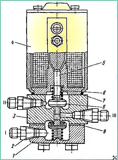 При включении электромагнита шток, выдвигаясь, прижимает верхний клапан 8 к седлу корпуса 3.