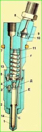 Когда давление в камере "Б", воздействующее на конус иглы, превысит сопротивление пружины 13, игла приподнимется до упора ее торца в проставку 3, при этом топливо через отверстия корпуса распылителя впрыскивается в камеру сгорания цилиндра.