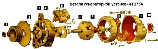 Щеткодержатель генераторной установки Г 273В имеет встроенный малогабаритный регулятор напряжения Я120М, представляющий собой схему в интегральном исполнении. Она служит для поддержания в заданных пределах напряжения, вырабатываемого генератором.