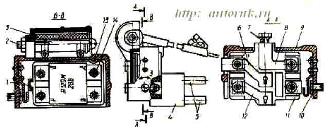 Этими выводами регулятор устанавливается в щеткодержатель так, чтобы выводы, помеченные буквами Ш, Д, В и Р, легли на токопроводящие шины.