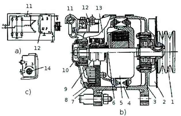 На генераторе имеются следующие выводы: «+» —для подключения аккумуляторных батарей и нагрузки, «—» — для подключения к массе автомобиля, «Ш» — для соединения с выводом «ВК» выключателя приборов и стартера и выводом «Ш» регулятора напряжения.