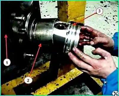 Деревянной стороной молотка аккуратно подбиваем поршень, следя за правильным положением болтов и вкладыша шатуна.