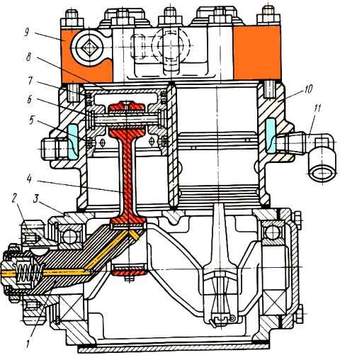 Выводим из зацепления зубчатое колесо компрессора с зубчатым колесом топливного насоса, передвинув компрессор вперед, и снимаем компрессор