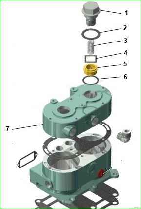 Головка компрессора: 1 – пробка нагнетательного клапана; 2, 6 – прокладка; 3 – пружина; 4 – клапан нагнетательный; 5 – седло нагнетательного клапана; 7 – головка компрессора