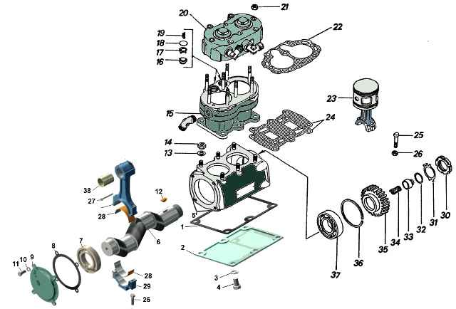 Компрессор пневмотормозов: 1, 8, 22 – прокладки; 2 – крышка картера нижняя; 3, 10, 13 – шайбы пружинные; 4, 11, 25 – болты; 5 – картер; 6 – вал коленчатый; 7, 37 – подшипники; 9 – крышка; 12 – шпонка; 14, 21, 26 – гайки; 15 – блок цилиндров; 16 – седло впускного клапана; 17 – направляющая впускного клапана; 18 – клапан впускной; 19, 34 – пружины; 20 – головка компрессора в сборе; 23 – поршень с шатуном; 24 – пластина отражателя; 27 – шплинт; 28 – вкладыш; 29 – крышка шатуна; 30 – гайка упорная; 31 – шайба замковая; 32, 36 – кольца упорные; 33 – уплотнитель; 35 – колесо зубчатое привода