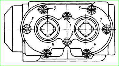 Гайки крепления головки цилиндров нужно затягивать в порядке указанном на рисунке, попарно в два приема.