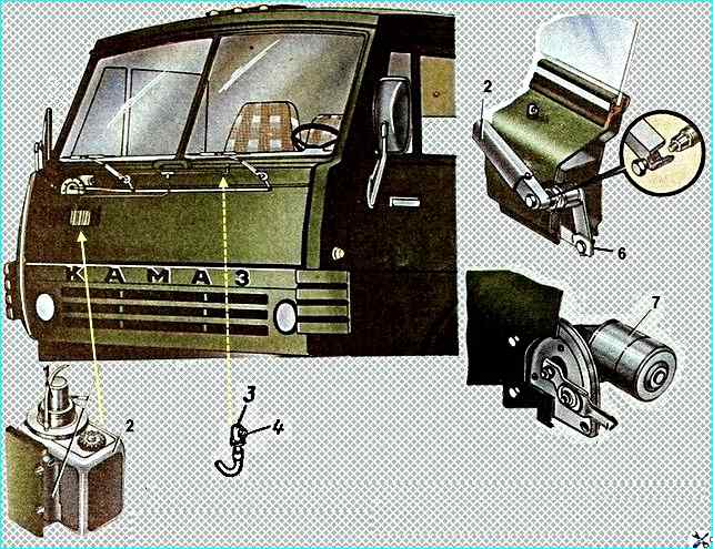 Электрическая схема и работа системы электроснабжения стеклоочистителя описана в статье - "Система стеклоочистки автомобиля КамАЗ"