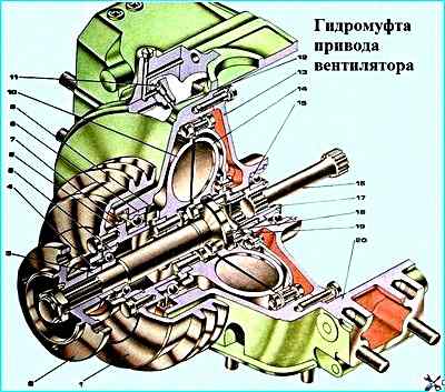 Гидромуфта привода вентилятора (см. рисунок) передает крутящий момент от коленчатого вала к вентилятору и гасит инерционные нагрузки, возникающие при резком изменении частоты вращения коленчатого вала.