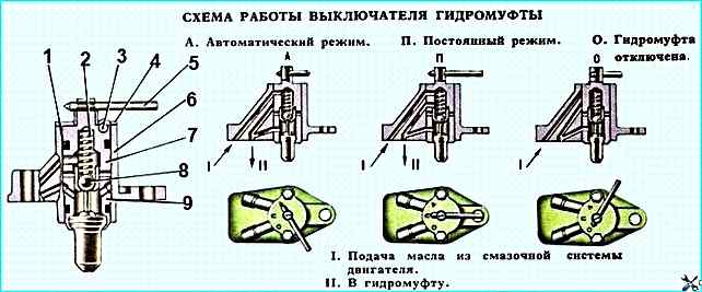 При этом находящееся в гидромуфте масло через отверстие в кожухе сливается в картер двигателя и вентилятор отключается;