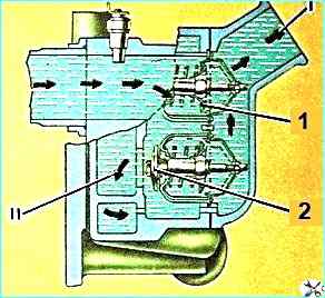 Из головок цилиндров нагретая жидкость по трубам поступает в коробку термостатов, из которой в зависимости от температуры направляется в радиатор или на вход насоса.