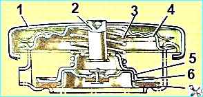 Пробка расширительного бачка: 1 - корпус пробки; 2 стойка клапана; 3 - пружина; 4 пружина крышки; 5 - выпускной клапан; 6 - впускной клапан; 7 - прокладка