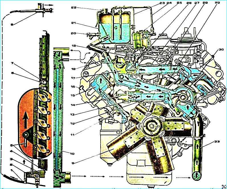 Схема системы охлаждения: 9 - крыльчатка вентилятора; 10 - радиатор; 11 - сливной кран системы охлаждения; 12 - подводящая труба правого полублока; 13 - патрубок подводящей трубы 14 выключатель гидромуфты привода вентилятора; 15 - головка цилиндра; 16 - рукоятка сливного крана; 17 - коробка термостатов; 18 - патрубок отвода охлаждающей жидкости из расширительного бачка в водяной насос; 19 патрубок отвода охлаждающей жидкости в отопитель; 20 - кран контроля уровня охлаждающей жидкости, 21 - расширительный бачок; 22 - паровоздушная пробка; 23 - перепускная трубка; 30 - водяной насос