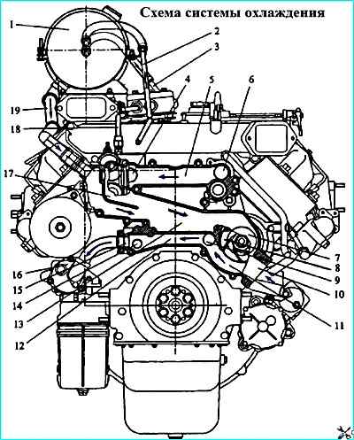 Схема системы охлаждения: 1 - расширительный бачок, 2 - пароотводящая трубка; 3 трубка отвода жидкости из компрессора; 4 канал выхода жидкости из правого ряда головок цилиндров: 5 - соединительный канал; 6 - канал выхода жидкости из левого ряда головок цилиндров; 7 - входная полость водяного насоса; 8 водяной насос, 9 канал входа жидкости в левый рад гильз цилиндров: 10 канал подвода жидкости в водяной насос из радиатора; 11 выходная полость водяного насоса; 12 соединительный канал; 13 перепускной канал из водяной коробки на вход водяного насоса; 14 канал входа жидкости в правый ряд гильз цилиндров; 15 канал отвода жидкости в теплообменник масляный; 16 теплообменник масляный; 17 - водяная коробка; 18 трубка подвода жидкости в компрессор; 19 перепускная труба